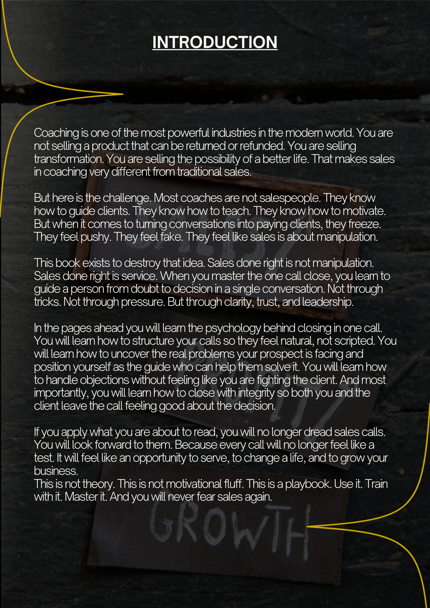 Most coaches struggle to turn conversations into paying clients. They know how to serve but they freeze when it comes to selling. This ebook is the complete playbook for mastering the one call close. You will learn the mindset shifts that make sales feel natural, the structure that guides every conversation, and the proven methods to handle objections and close with integrity.